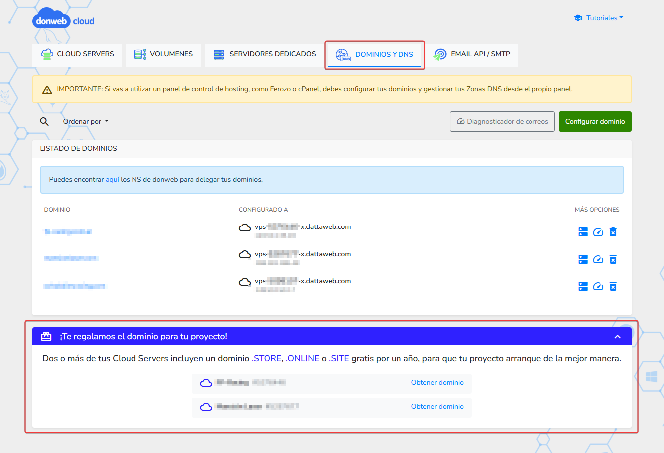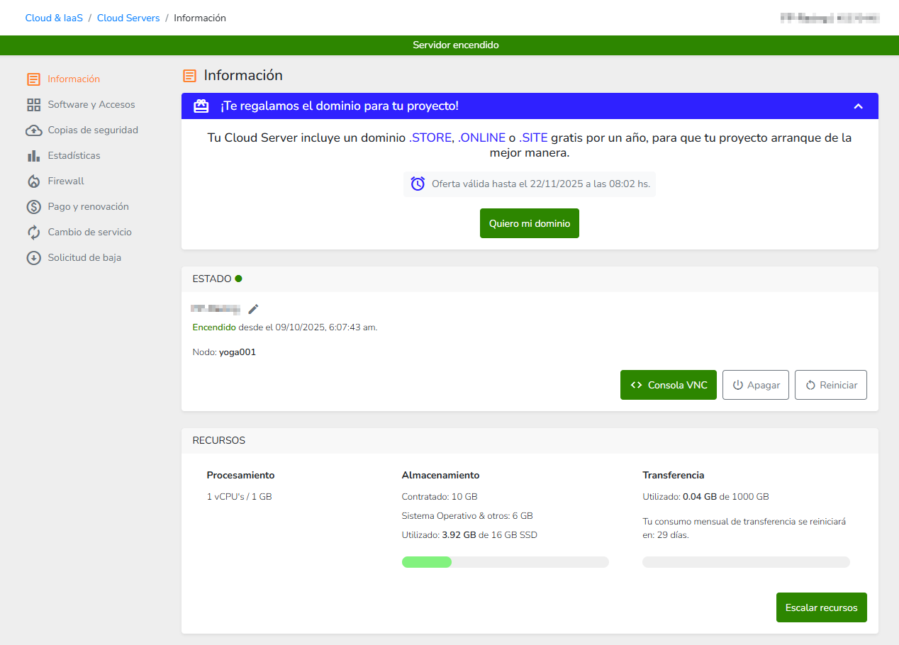 También podrás registrar tu dominio Gratuito desde "Mis servicios", "Cloud server", "Dominios y DNS"