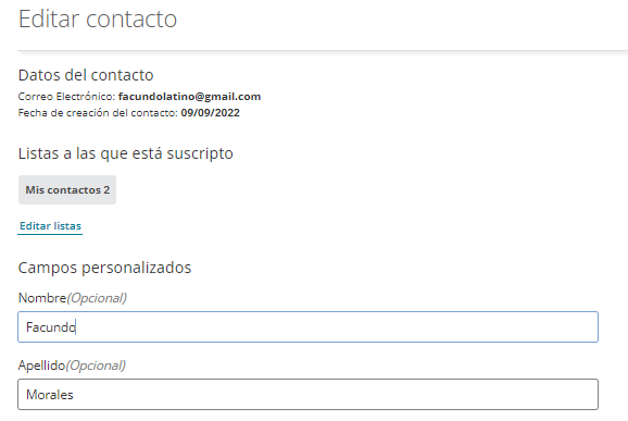 ❕Ten en cuenta que en el caso de las cuentas gratuitas solo tendrás dos campos personalizados para editar (nombre y apellido), mientras que con las prepagas o de planes mensuales puedes agregar hasta 100 campos personalizados y editarlos. - Editar sus suscripciones desde la pestaña Listas.