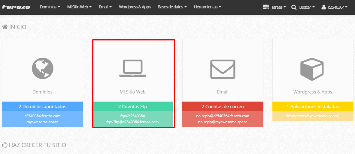 En la página principal de tu panel de hosting Ferozo, haz clic sobre el icono "Mi sitio web".