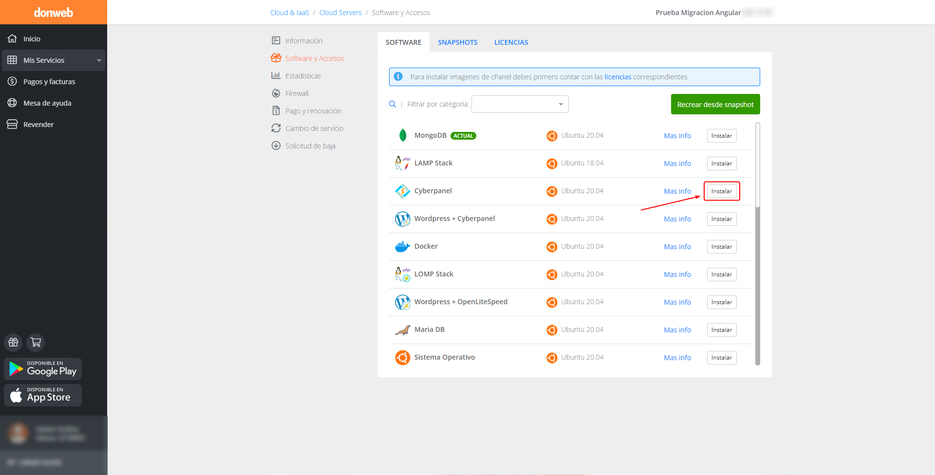 Ingresa a tu Cuenta DonWeb y haz clic en "Mis servicios". En el desplegable que se muestra, presiona el botón “Cloud & IaaS” y luego en el botón que dice "Gestionar".