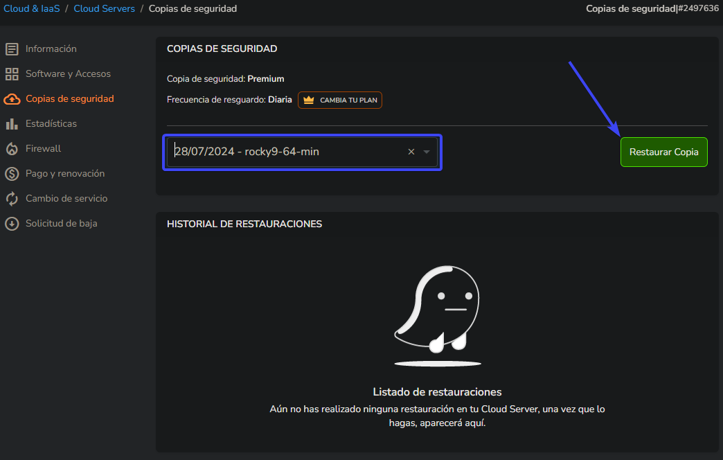 Si posees el Plan Premium Semanal o el Plan Premium Diario, puedes restablecer cualquier copia de seguridad desde tu área de cliente cuando lo necesites, con los siguientes pasos: