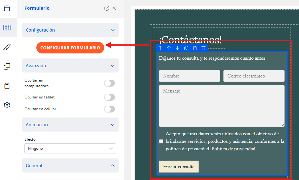 - Verás que se abre un recuadro donde podrás configurar el contenido y estilo del formulario:
