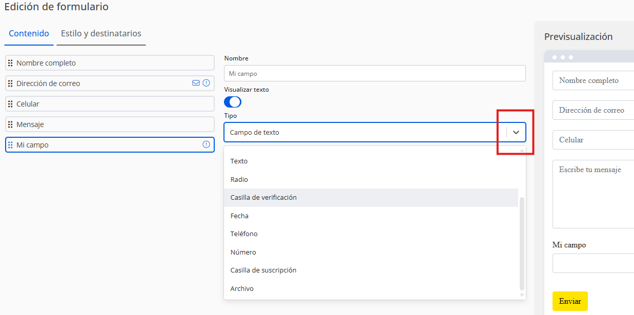 - Listado: para que seleccionen una opción desde un menú desplegable.
