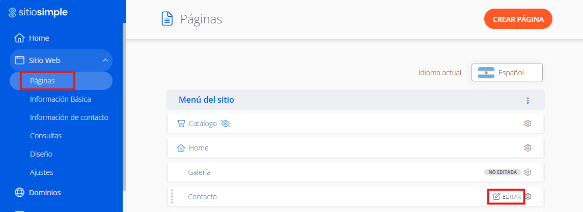 - Haz clic en "Sitio Web" y luego en "Páginas".