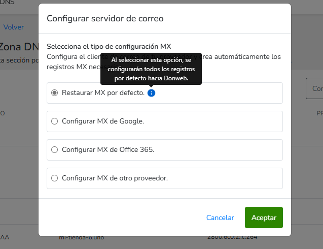 - Elige "Restaurar MX por defecto" y se configurarán tus registros de correo hacia Donweb.