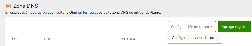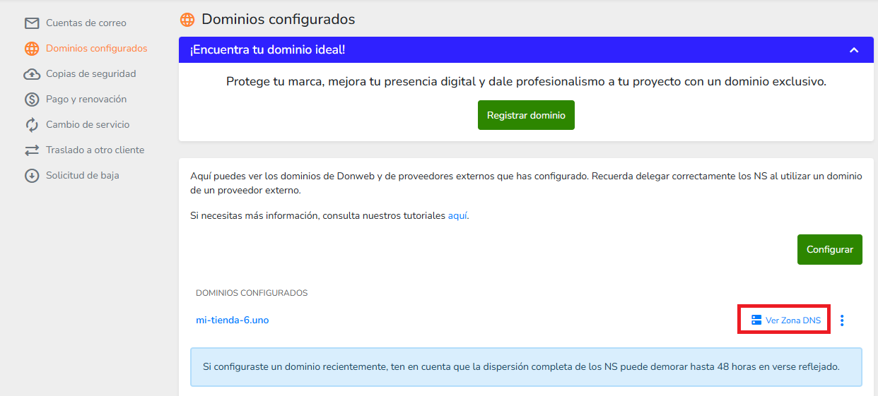 - Dirígete a la pestaña Dominios configurados, y haz clic en el menú (3 puntitos) del dominio apuntado y selecciona "ZONA DNS"