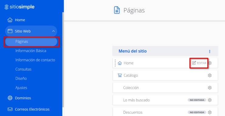 - Ingresa al creador de SitioSimple, haz clic en "Páginas" desde el menú principal, selecciona la página que deseas modificar y presiona el botón "Editar".