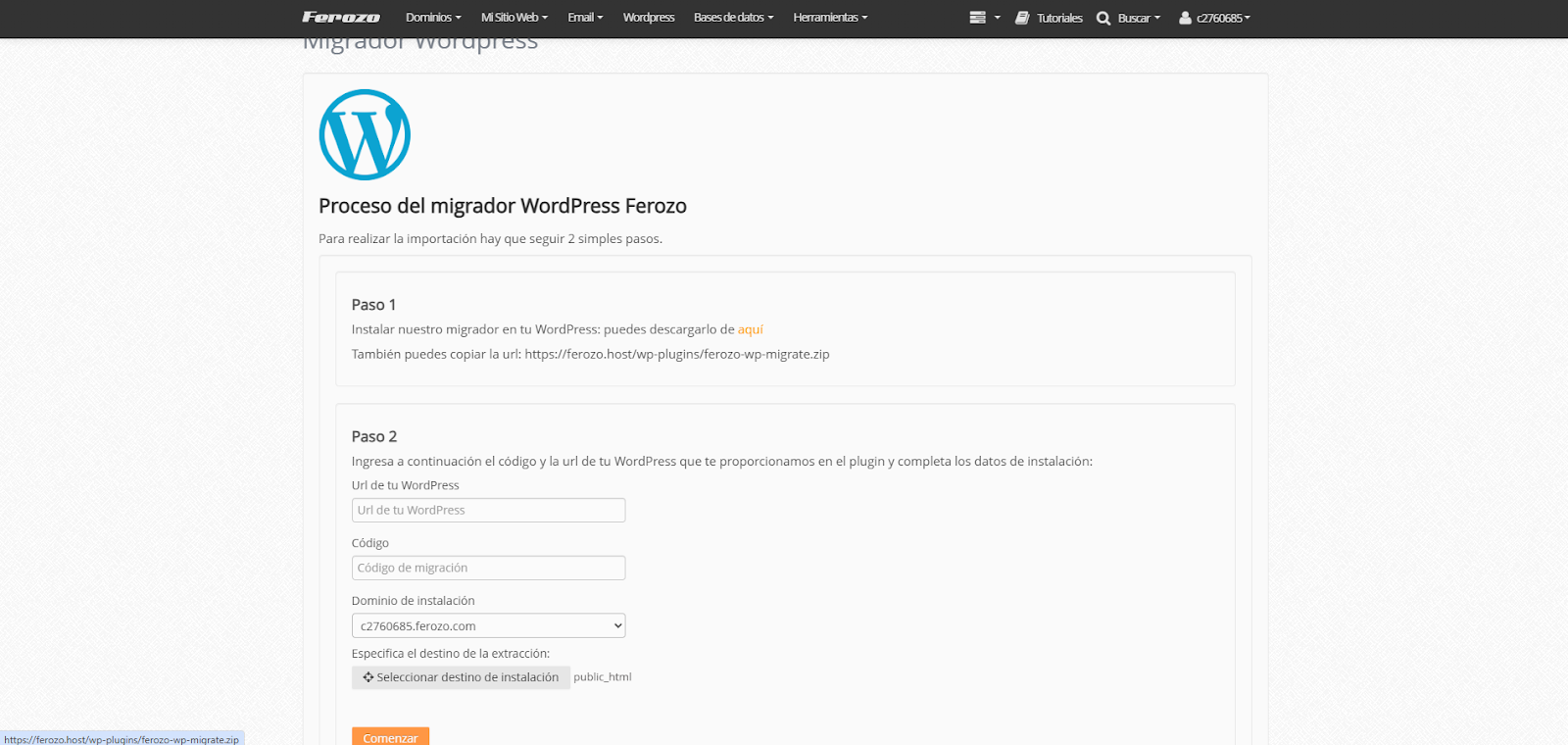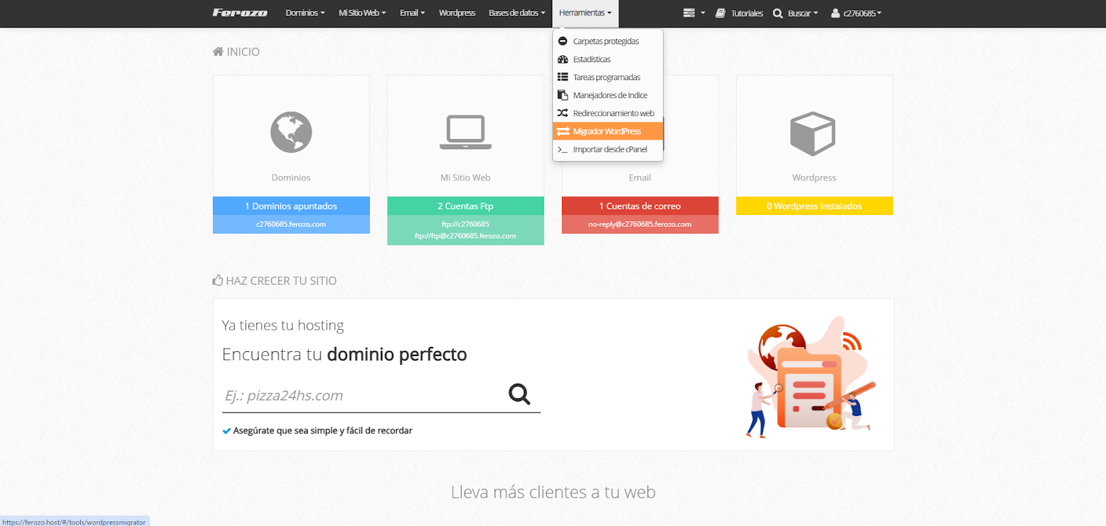 Ingresa al Panel Ferozo y dirígete a la sección “Herramientas”. Dentro de ese menú, haz clic en “Migrador WordPress”.