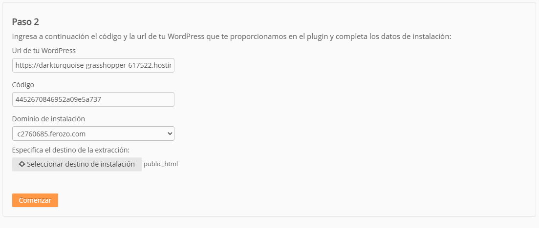 Copia exactamente esos datos y pégalos en el Paso 2 del migrador dentro de tu cuenta de hosting Ferozo, que es el destino donde se va a migrar el sitio.