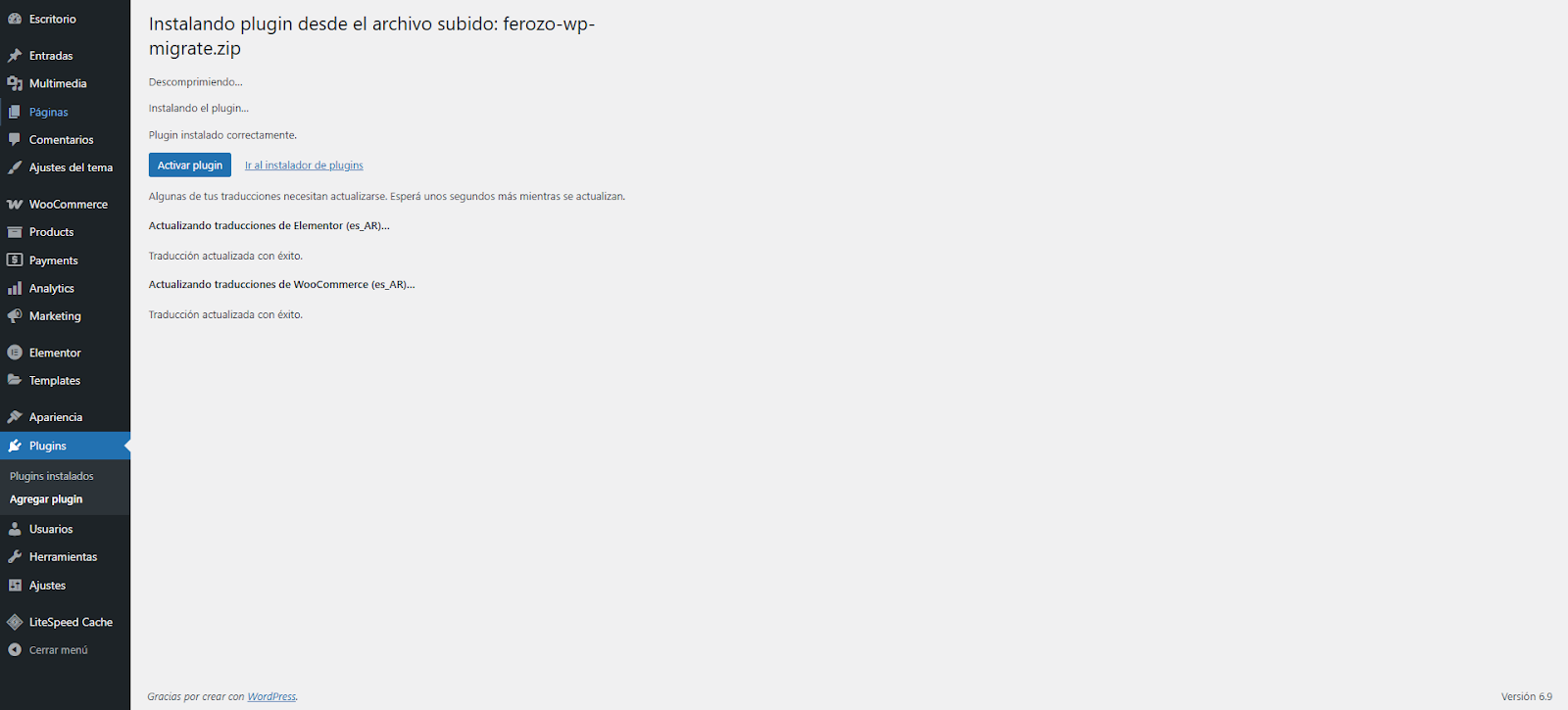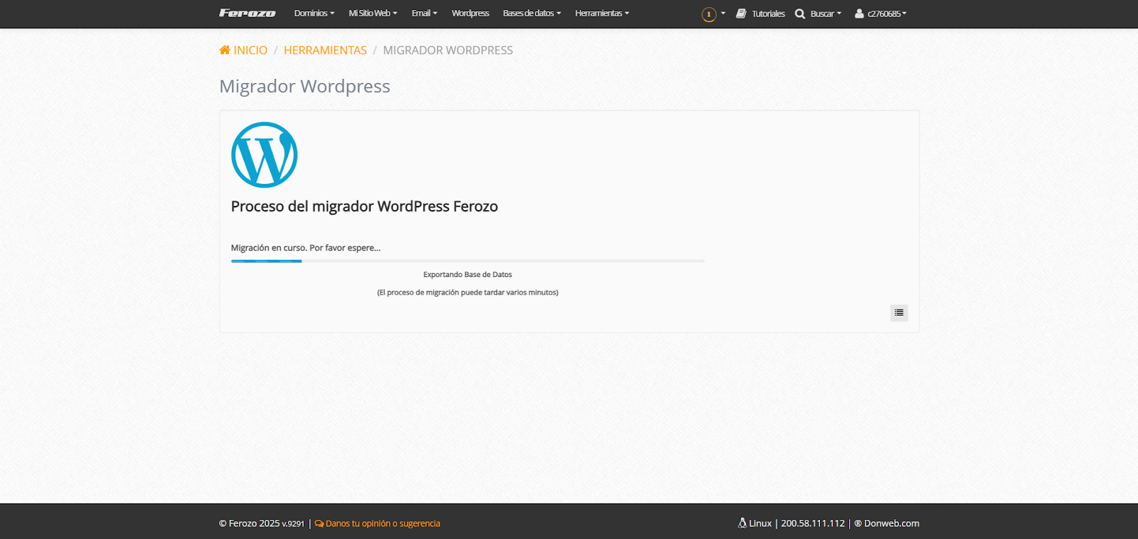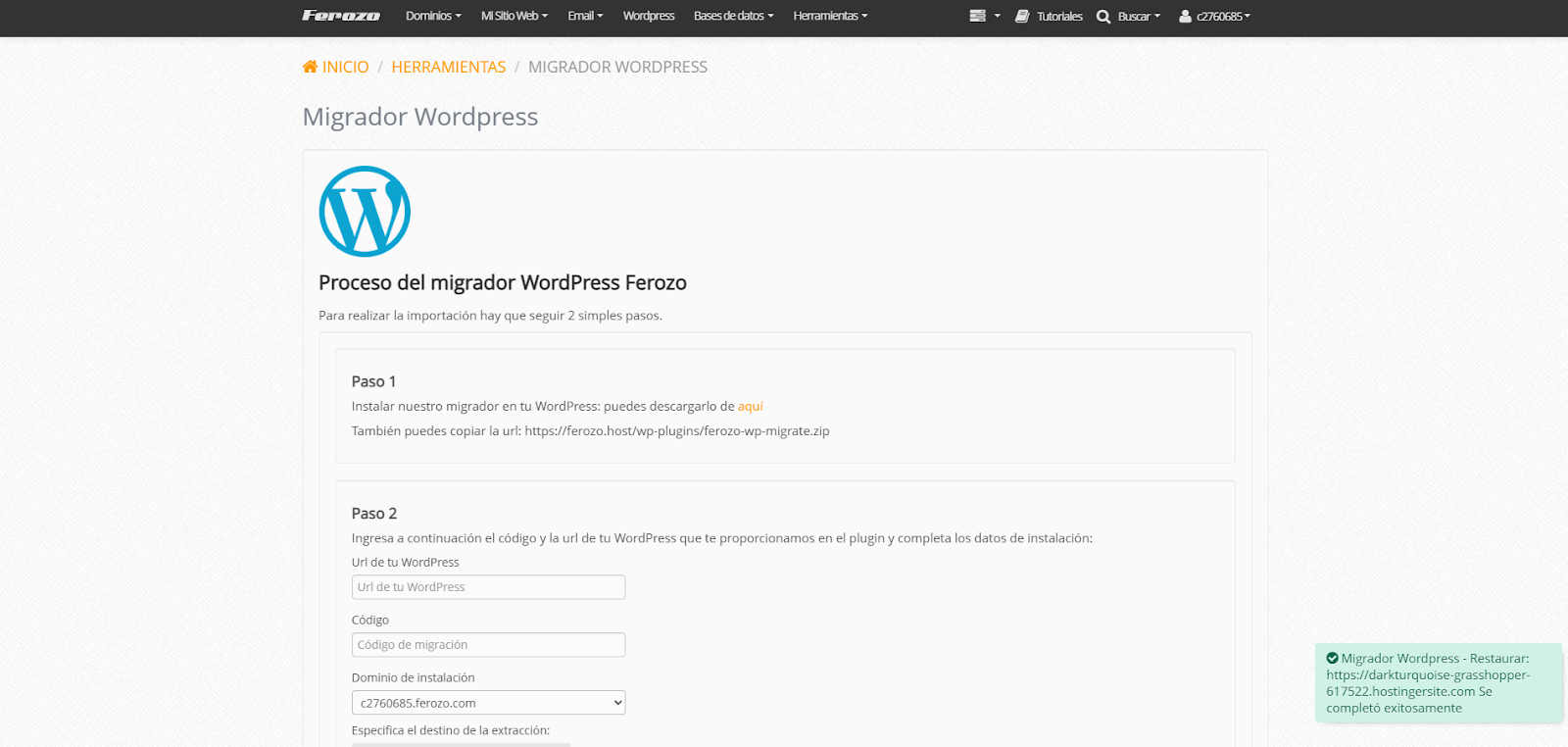 Cuando la migración haya finalizado correctamente, verás un mensaje de éxito en el panel Ferozo.