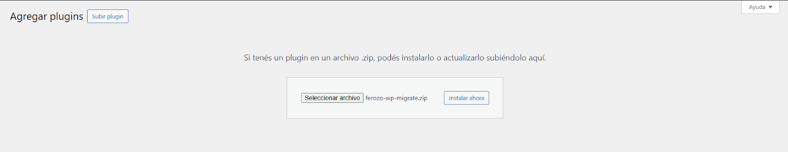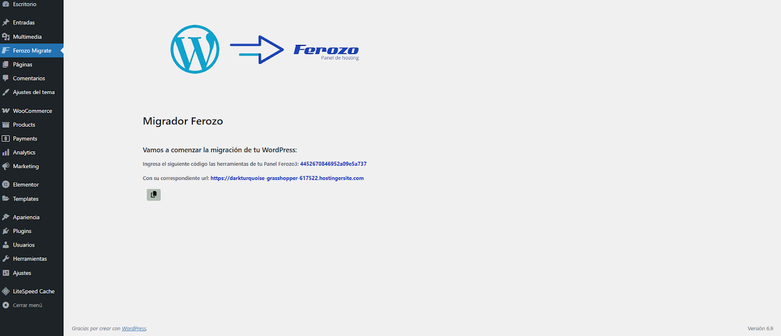 Con el plugin activo, busca en el menú lateral del panel de WordPress la opción “Ferozo Migrate”.