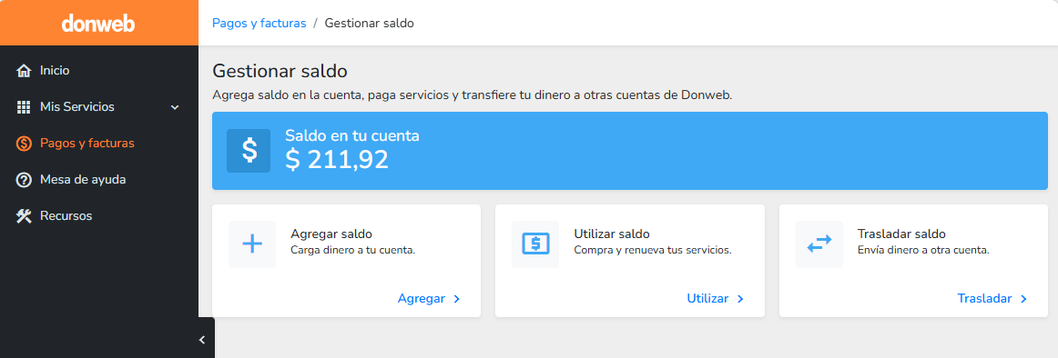 La sección Gestionar saldo, dentro del menú Pagos y facturas, te permite administrar el dinero disponible en tu cuenta de Donweb.
