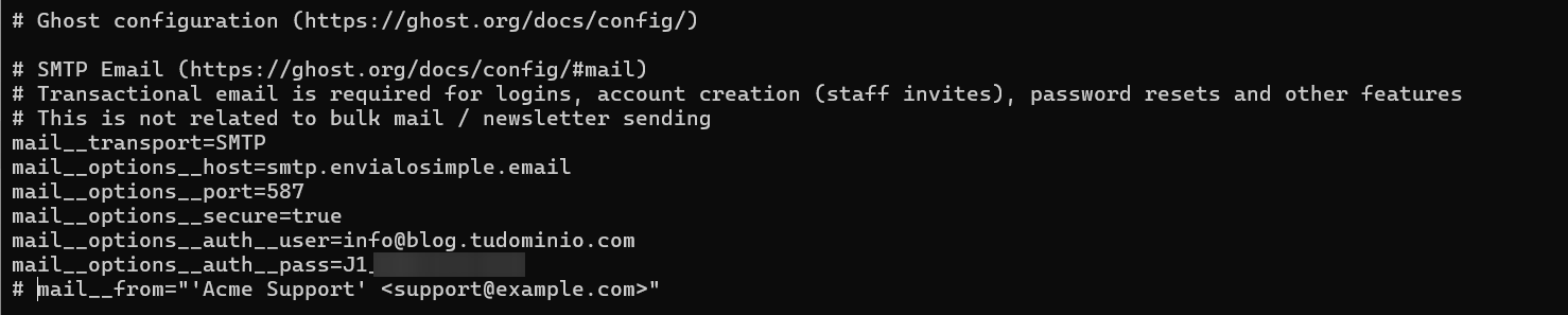 Para configurar un servidor SMTP en Ghost, deberás editar el archivo .env que encontrarás en la ruta /root/app de tu Cloud Server. Allí agregarás los siguientes parámetros, completándolos con los datos de tu servicio SMTP.