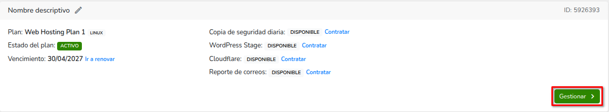 - Busca el hosting en el que quieres configurar el dominio y haz clic en Gestionar.