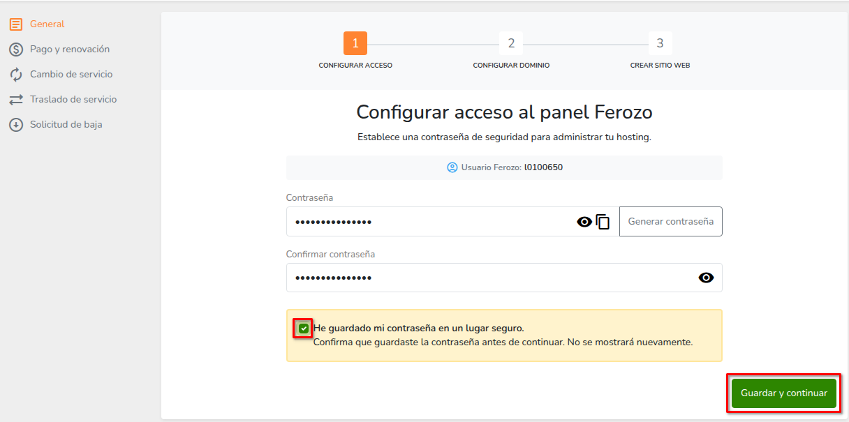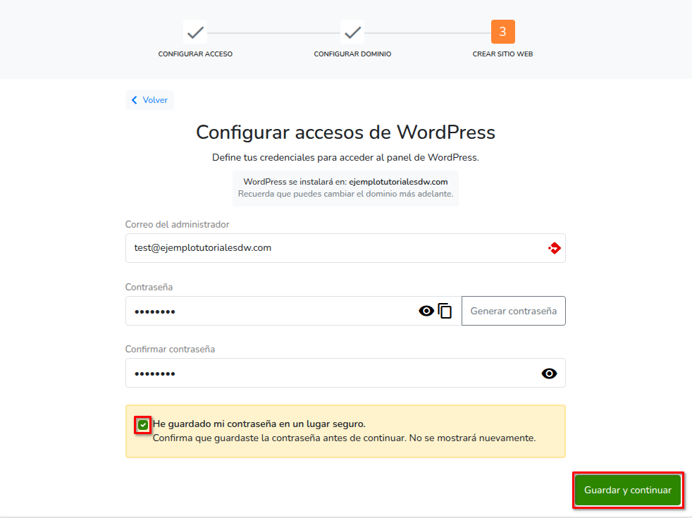 - Crea una contraseña para el panel, marca la casilla de confirmación y haz clic en Guardar y continuar.