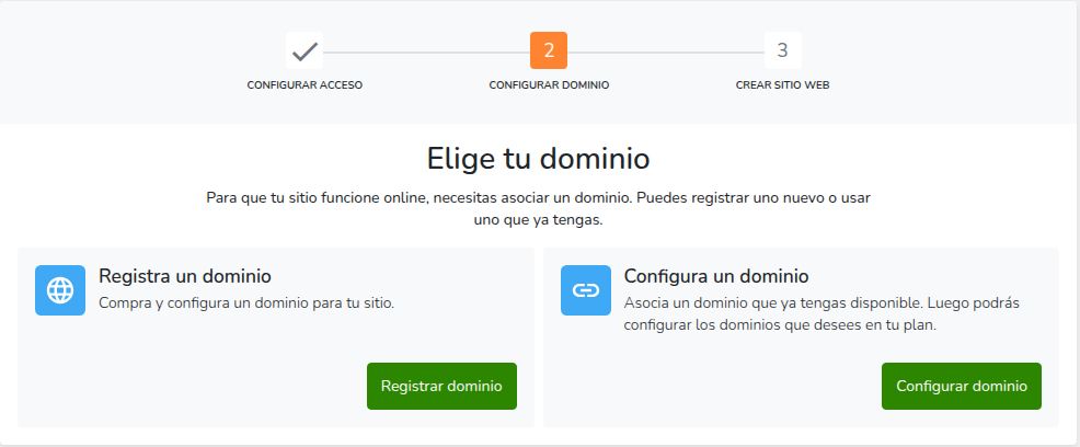- Elige si quieres registrar un dominio nuevo o utilizar uno existente.