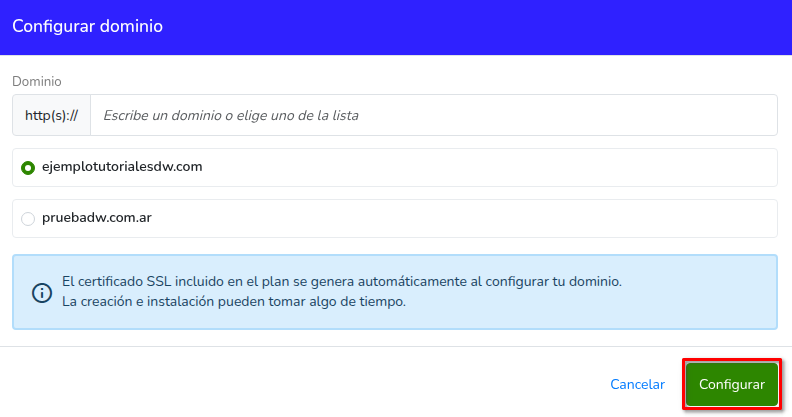 - Ingresa el nombre del dominio o selecciona uno de la lista y haz clic en Configurar.