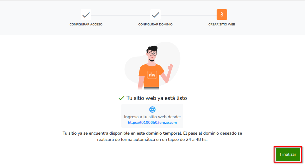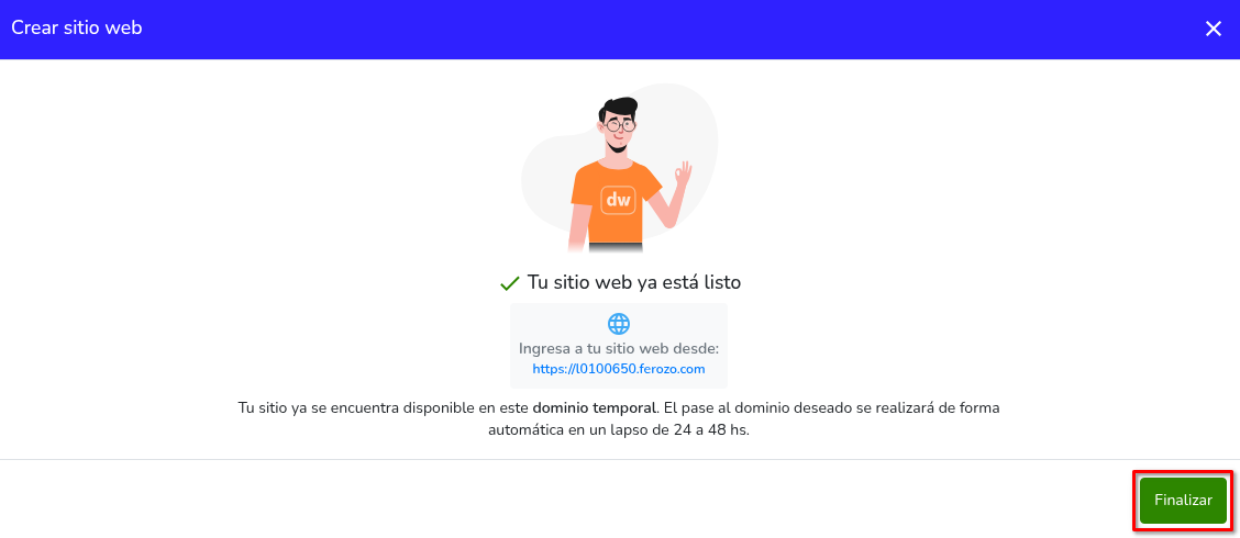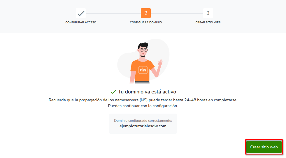 - Cuando el dominio esté configurado, presiona en Crear sitio web.