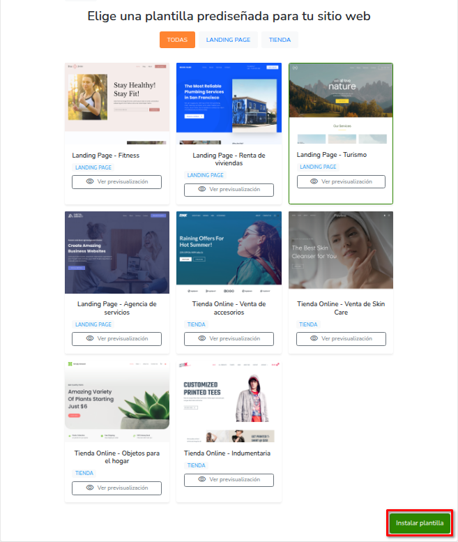 - Selecciona una plantilla y haz clic en Instalar plantilla. Si quieres, antes de elegirla, puedes previsualizarla desde Ver previsualización.