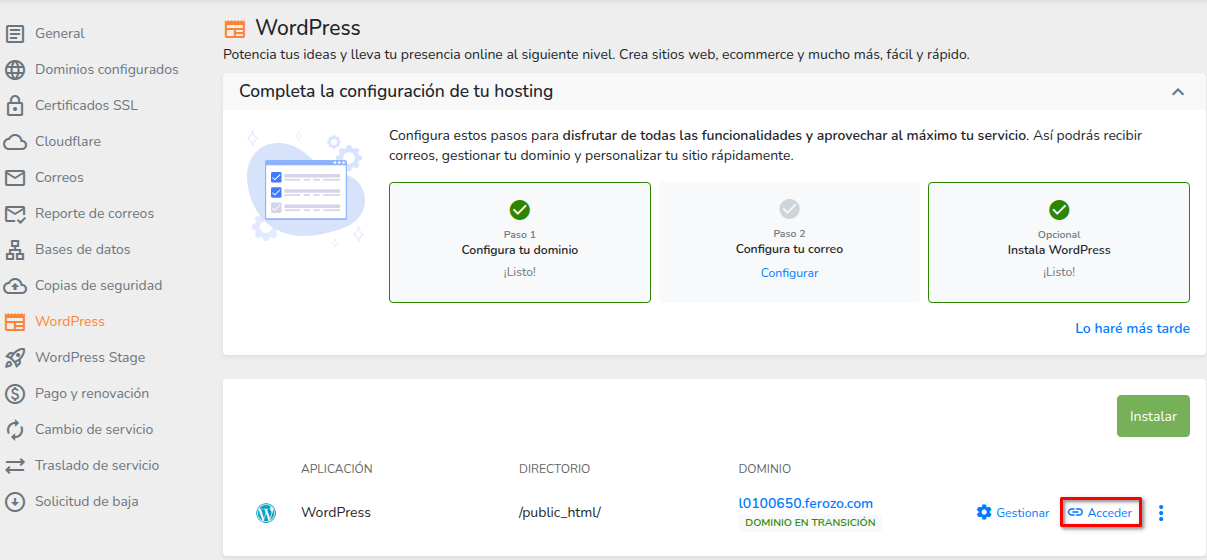 - Luego, podrás ingresar a WordPress desde el botón Acceder.