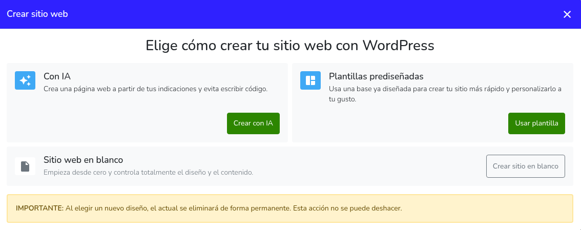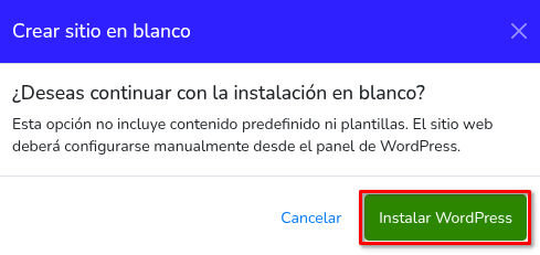 - Al seleccionar Crear sitio en blanco, se abrirá un modal donde deberás confirmar la instalación haciendo clic en Instalar WordPress.