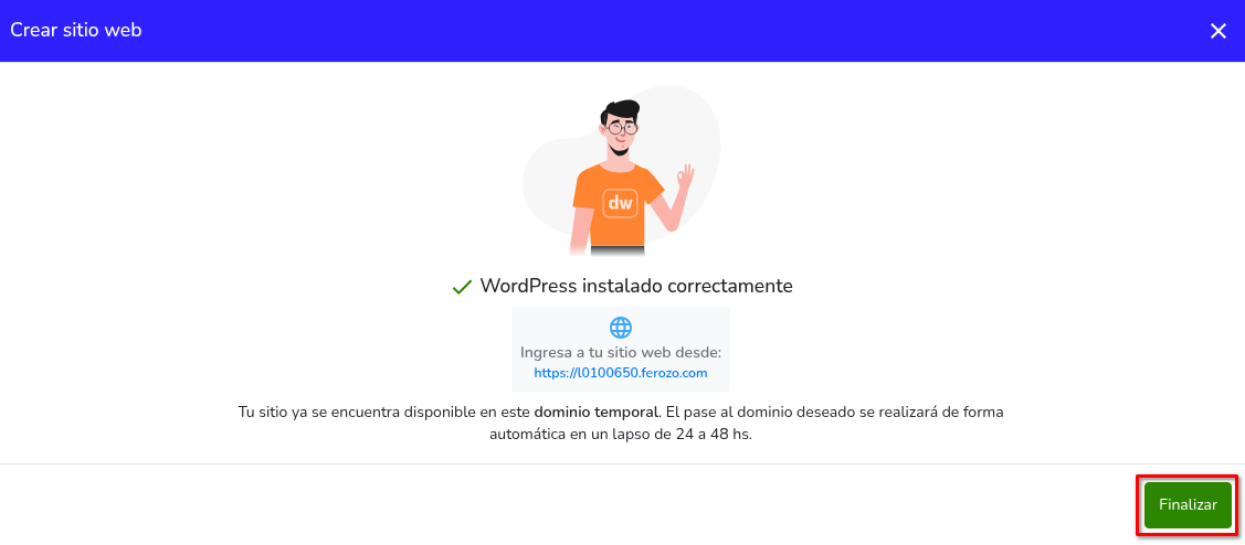 - WordPress comenzará a instalarse. Una vez finalizada la instalación, haz clic en Finalizar.